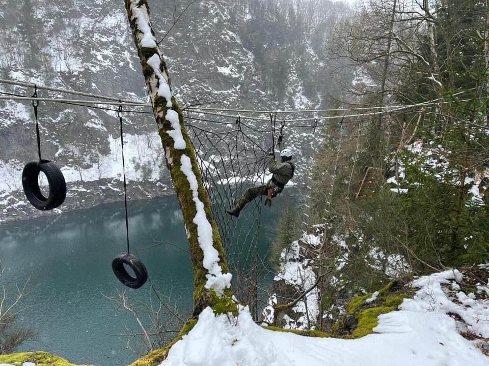 De defensiekreet ‘Verbeter jezelf en de wereld’ kreeg een wel heel bijzondere lading voor deze militair van 102 Constructiecompagnie bij een winterse grensverleggende activiteit. Werken op hoogte en doorzettingsvermogen stonden hierbij centraal.