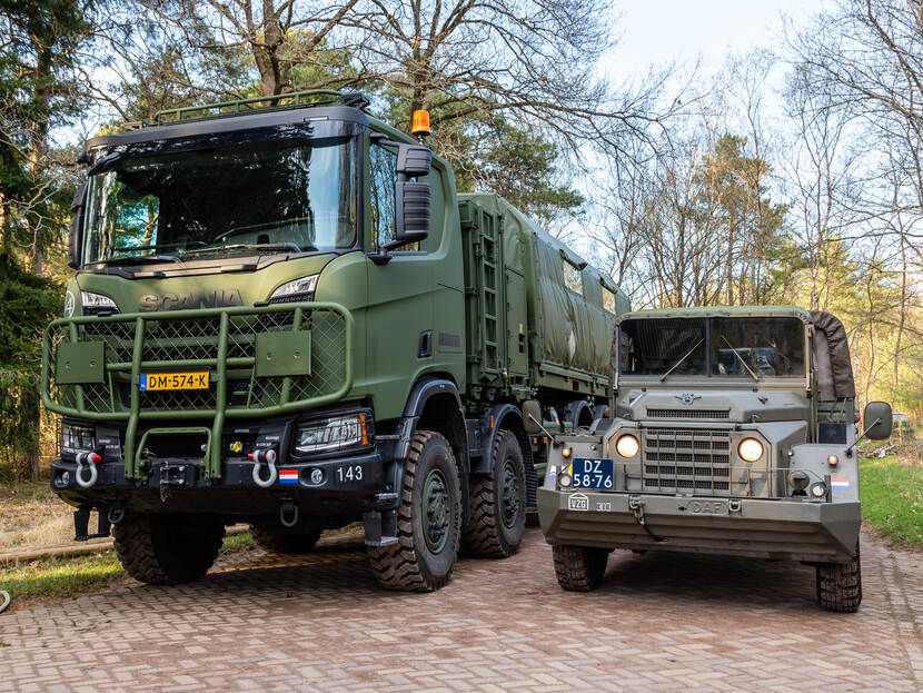 Martin Bos fotografeerde vorige week op de Leusderheide de DAF YA-126 lichte militaire vrachtauto naast een reusachtig ogende Gryphus vrachtwagen van 130 Bevocie. De nieuwe truck lijkt wel de grote broer van de YA-126, die Bos terecht de bijnaam DAF-je heeft gegeven.
