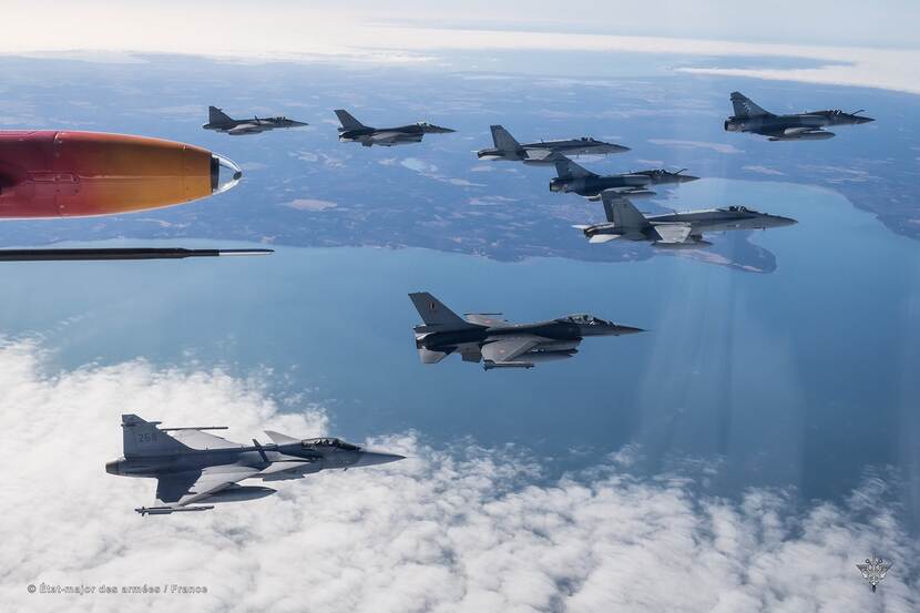 De Franse luchtmacht maakte deze foto tijdens de oefening Ramstein Alloy 22-1 in Geilenkirchen. De twee Mirages 2000 vliegen voorop, in goed gezelschap van twee Finse F/A-18C Hornets, een duo Belgische F-16's en twee Zweedse Saab Gripen's. Voor de oefening, die meerdere keren per jaar wordt gehouden, werden vijftig sorties (vlucht van een of meerdere vliegtuigen) gevlogen.