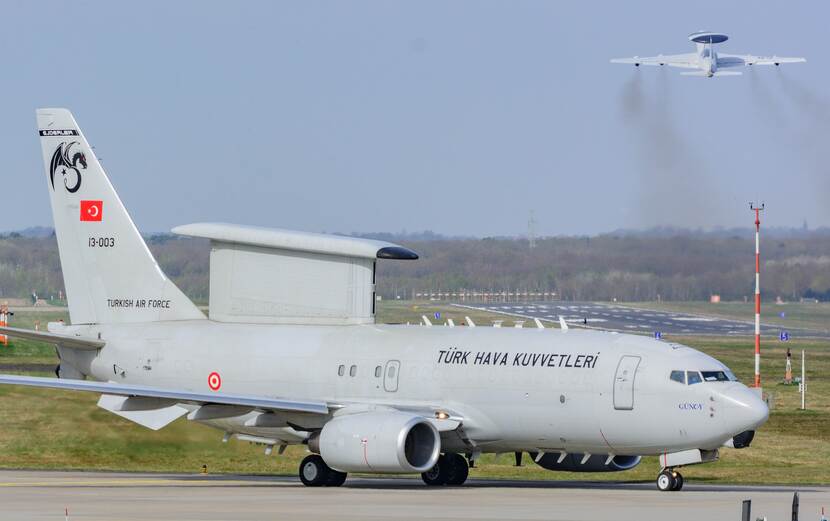 Terwijl op de achtergrond een E-3A Sentry van de NAVO het luchtruim kiest, poseert een E-7T van de Turkse luchtmacht geduldig voor een NAVO-fotograaf. De toestellen bewaken het luchtruim met hun radarsysteem en de grote antenne op de romp. De E-7T was op vliegbasis Geilenkirchen voor de oefening Ramstein Alloy 22-1.