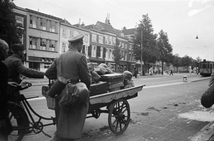 Het is Dolle Dinsdag. De dag waarop berichten ons land bereiken dat de bevrijding nabij zou zijn en de Duitsers in ons land massaal op de vlucht slaan. Hun haastige vertrek, zoals hier in Den Haag, brengt hoop bij de bevolking op een spoedige bevrijding. Maar schijn bedriegt; de Duitsers hergroeperen zich en nemen de touwtjes weer stevig in handen. Er wacht voor een deel van Nederland nog een loodzwaar laatste oorlogsjaar. Foto: Menno Huizinga, collectie NIOD.
