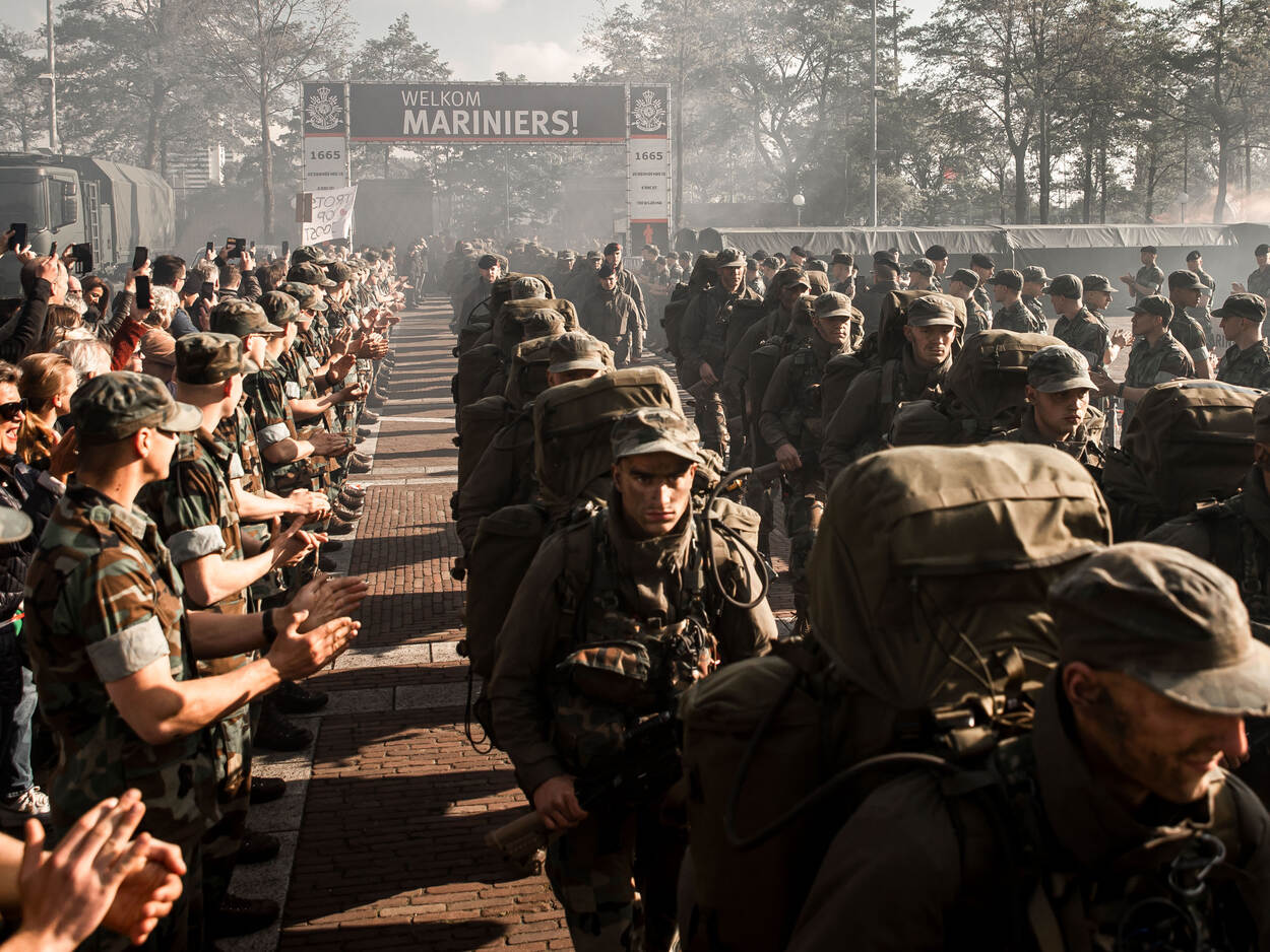 Sergeant Jasper Verolme was erbij toen onlangs weer een kersverse lichting mariniers (blok 21-3) binnenmarcheerde op de Rotterdamse Van Gent kazerne. De traditie van de afsluitende oefening, de Finex (final exercise), van hun opleiding. Na een week flink afzien moeten de mariniers, dan nog in spé, op die laatste dag nog 25 kilometer lopen met volle bepakking. Marinier word je niet zo maar, vandaar dat ze met groot applaus worden ontvangen.
