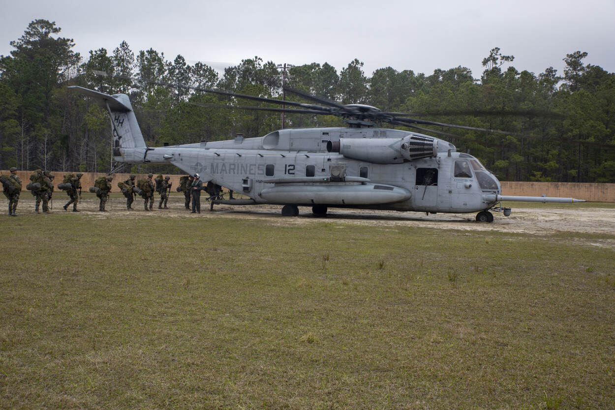 'Stilstaan. Wachten tot we doorgaan. Mag ik even voorgaan? Want ik wil naar huis', zo luidt de tekst van het liedje dat André van Duin ooit zong over files. Of de mariniers van het Marine Squadron Carib naar huis willen valt nog maar te bezien, want oefenen in Camp Lejeune in North Carolina is natuurlijk hartstikke leuk. Vooral als je mee mag vliegen. We vermoeden dus dat ze met een 'big smile' in de file staan om aan boord te gaan van de heli. Foto: Lance Corporal Adam Scalin.