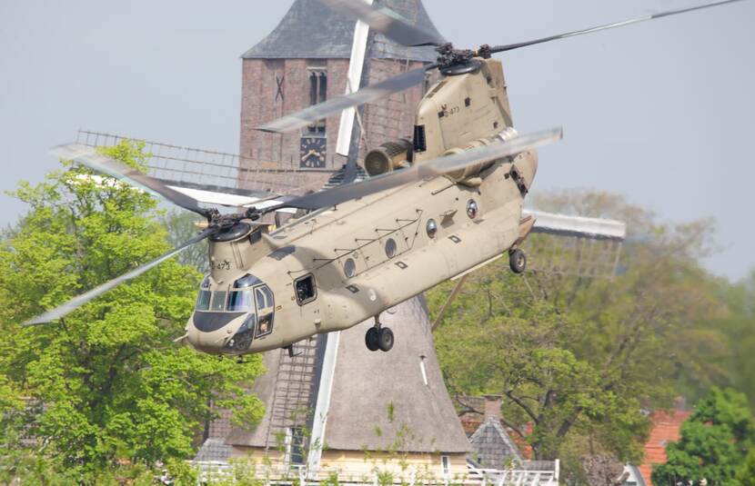 Hollandser dan dit wordt een militaire foto niet. Onder meer een Chinook Foxtrot D-473 oefende deze week in de omgeving van het Overijsselse Raalte. De foto maakte Daan Westenberg (Dutchaviationphotography) bij het gemeentehuis in Dalfsen.