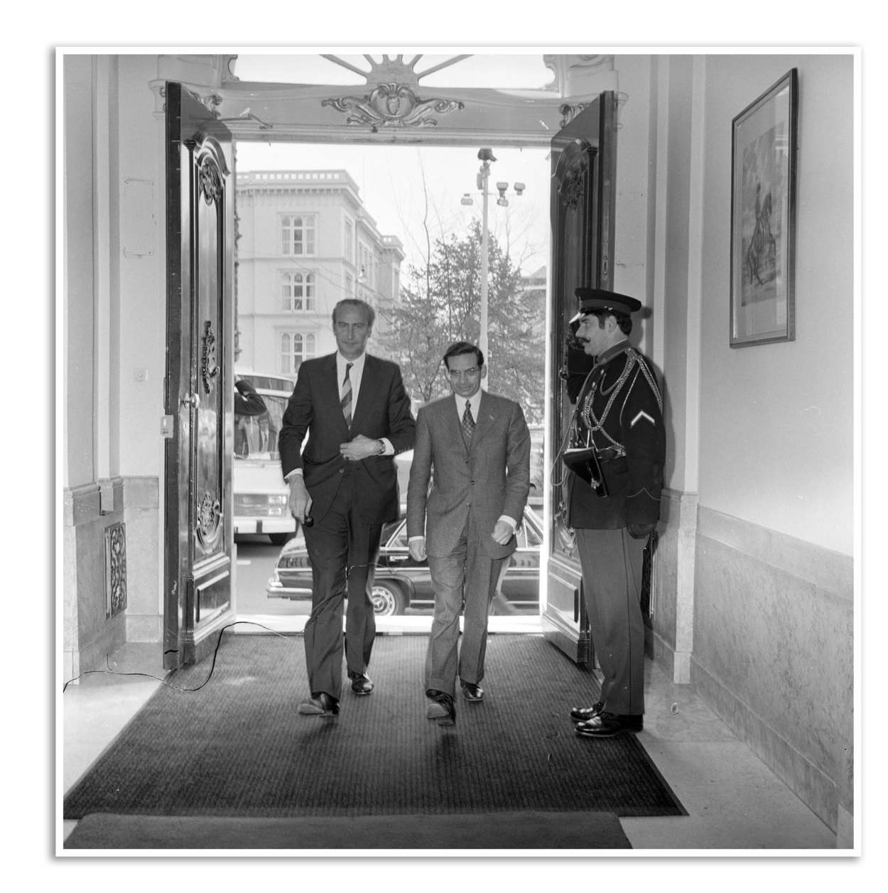 Als kersverse minister van Defensie wordt Henk Vredeling (links) op 11 mei 1973 het ministerie van Defensie binnengeleid door secretaris-generaal Gerard Peijnenburg.
