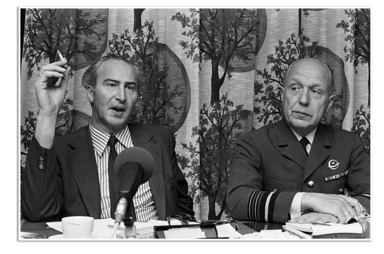 Henk Vredeling op een persconferentie over de F-16 aanschaf in Nieuwspoort op 27 mei 1975. Rechts naast hem de directeur materieel van de luchtmacht, luitenant-generaal Herman Stokla. Foto: Hans Peters, Nationaal Archief, Anefo.