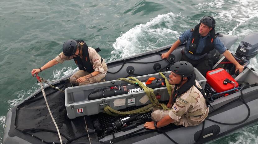 Met 25 landen, 46 schepen, 5 onderzeeboten, 200 vliegtuigen en 25.000 mannen en vrouwen personeel is RIMPAC de grootste internationale maritieme oefening ter wereld. Op en rond de kust van Zuid-Californië beoefenen deelnemers hun vaardigheden in het veilig maken en houden van scheepscorridors. Ook de Nederlandse marine doet mee. Op de foto Unmanned Underwater Vehicle Operators, Martijn Wilbrink and Sascha Lagendijk, met een REMUS 100 voor het opsporen en onschadelijk maken van mijnen. De foto werd genomen door RNLN LT Maurice van Ginneken.