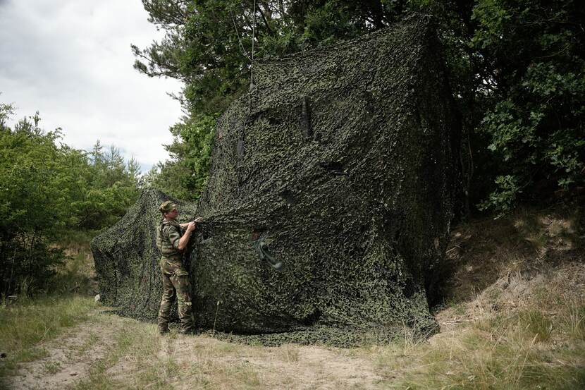 We gaan even lekker camoufleren. Vertelt u ons maar eens welk voertuig 'verstopt' zit onder dit grote groene camouflagenet. Enig idee? Niet? Zullen we het dan maar vertellen? Het is een grote 'tropco' vrachtwagen van het Operationeel Ondersteuningscommando Land van de Koninklijke Landmacht. O ja, tropco staat voor trekker-opleggercombinatie en da's een heel grote vrachtwagen. (Foto: OOCL)