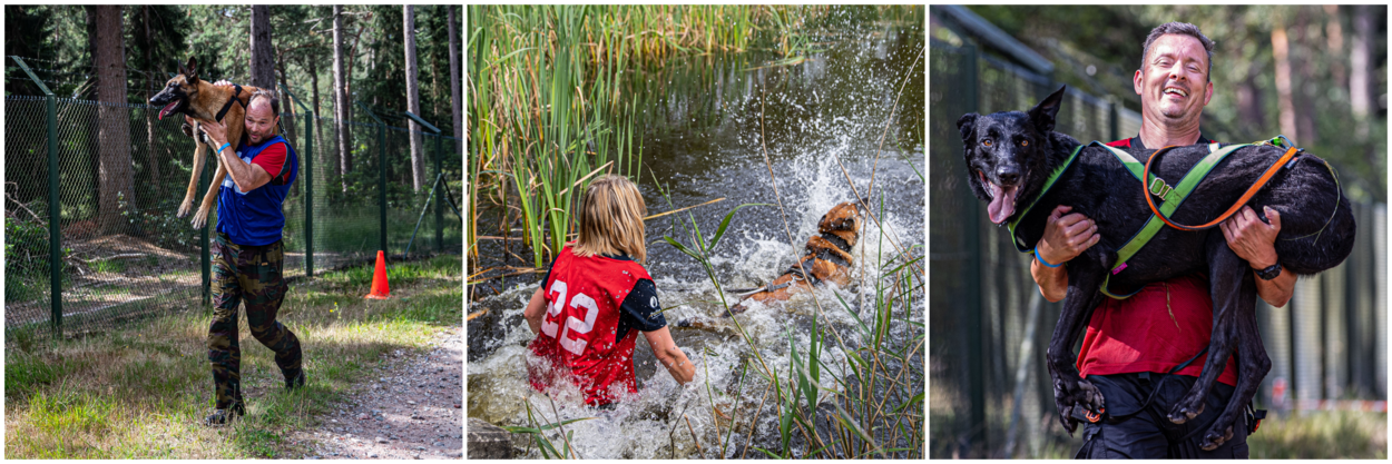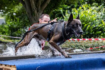Politieman Alex Versteeg van de Hondenbrigade Rotterdam heeft een lastige Hondenbiatlon achter de rug. “Raco is nieuw, conditioneel nog niet goed en heeft last van de warmte”, legt hij uit. “Een hond die het té warm krijgt kan hittestuwing krijgen en hartfalen. Een hond zweet niet makkelijk en koelt alleen af via zijn bek en door met zijn pootjes in het water te gaan staan. Maar volgend jaar weer. De Hondenbiatlon is een gezellige boel.”