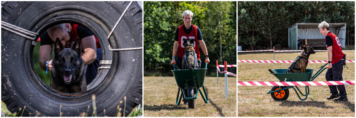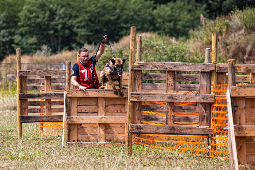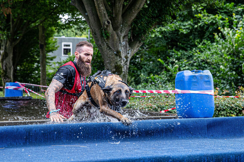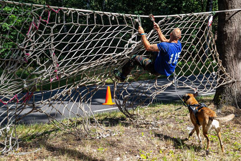 Dat wordt verderop bewezen, waar een koppel zich door een (droge) greppel worstelt, dat is afgedekt met een camouflagenet. “Kom op! Nee, nu naar rechts. Goed zo, jongen.” De hond volgt de instructies van zijn baas even braaf als nauwkeurig. Zwetend en hijgend koersen ze in looppas naar de volgende hindernis.