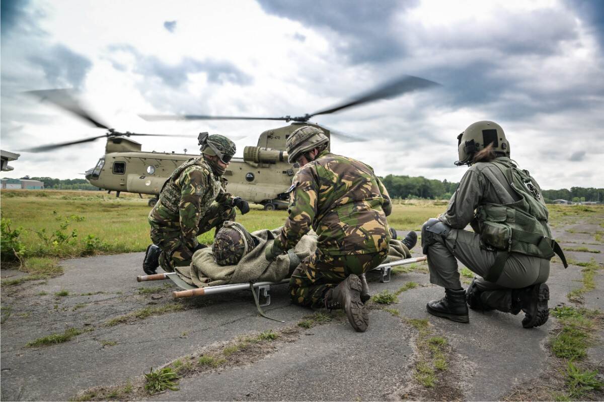 Een ketentraining komt voor het Geneeskundig Bataljon zelden voor. Daarom greep 421 Hospitaalcompagnie onlangs de kans met beide handen aan om te trainen met 11 Luchtmobiele Brigade en 298 Squadron in Gilze-Rijen. Oefenen in een ‘groene’ setting hebben de genezeriken de afgelopen jaren sowieso weinig kunnen doen. Veel personeel heeft tijdens de coronacrisis ondersteund bij zorginstellingen en veel medewerkers zijn ingezet voor de ‘Very High Readiness Joint Task Force’ (VJTF). Foto: Koninklijke Landmacht.