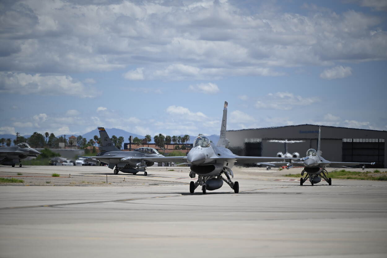 Vorige week meldden we al dat er na 32 jaar een eind is gekomen aan de opleiding van Nederlandse F-16-vliegers in Tucson, Arizona. Wie vanaf nu bij Defensie in een jachtvliegtuig wil leren vliegen, doet dat in een F-35. De opleiding hiervoor wordt zo’n tweehonderd kilometer verderop gegeven, op Luke Air Force Base in Phoenix. De foto van de ‘uittaxiënde’ Nederlandse F-16's had u als lezer nog tegoed. Het beeld werd gemaakt door major Angela Walz van de U.S. Air National Guard.