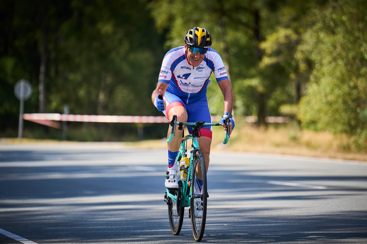 De 62-jarige kolonel buiten dienst (marechaussee) Freddy Aarts hoopte in het NMK met fietsvrienden een mooi wielerfeest te beleven. Na al die jaren is hij nog steeds in de ban van de sport. En de telg uit een wielerfamilie voelt zich na zijn FLO nog steeds verbonden met Defensie. Evenals Luijten reed hij in de klasse Masters 2. “De eerlijkheid gebiedt te zeggen dat ik de koplopers waarschijnlijk niet kan bijbenen”, zegt Aarts even voor het startschot. “Ik word immers elk jaar ouder, de kloof met de jonge renners groeit. Bovendien reed ik door de pandemie lange tijd geen wedstrijd. Het NMK voor mij te hoog gegrepen? Het bloed kruipt waar het niet gaan kan, al moet ik mijn doelstellingen, podium rijden, bijstellen. De wedstrijd uitrijden, dát is wat ik nu wil. Een goede renner heeft karakter en zet onder alle omstandigheden dóór, zal ik maar zeggen.”