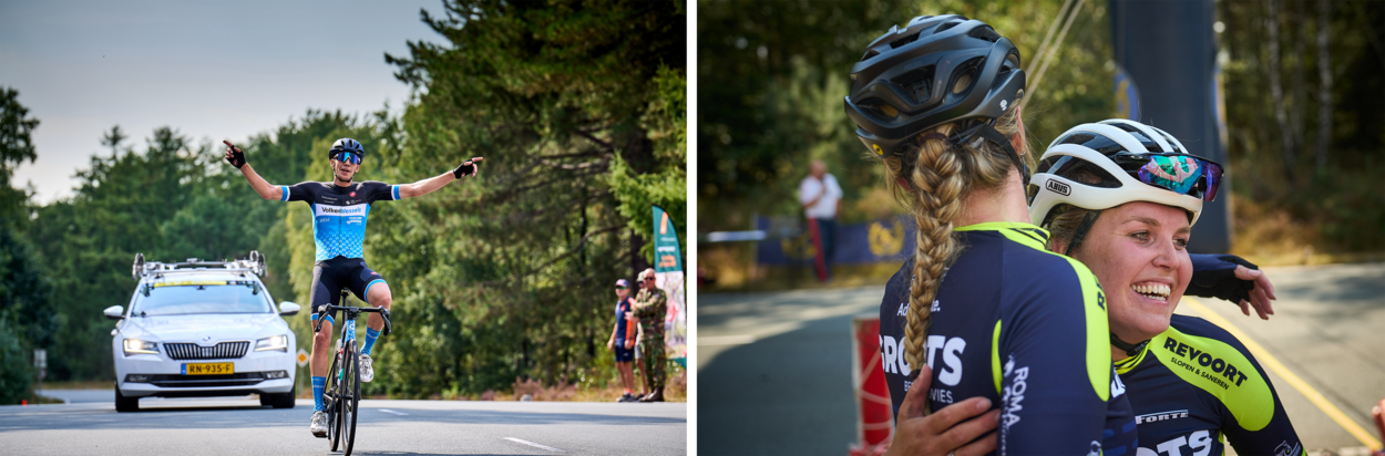 Links: De voorsprong van NMK-winnaar kapitein Bart Lemmen op de nummer twee van het eindklassement, KMA-cadet Jody Jochems, bedroeg een dikke twintig seconden. ”Ik heb zelden zo hard gereden.” | Rechts: Liena de Jong (rechts) kon haar geluk na afloop niet op. “Ik heb jaren gestreden voor deze titel.”