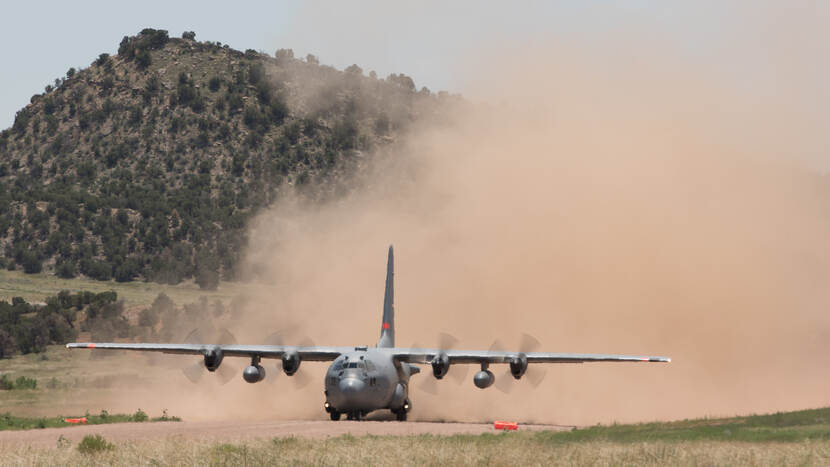 Een landing of (door)start van een C-130 Hercules op een zogenoemde dirtstrip is altijd spektakel. We prijzen ons dan ook gelukkig dat sergeant-majoor Sebastiaan van 11 Bevoorradingscompagnie AALST (Air Assault) zijn camera paraat had. Deze foto is geschoten tijdens de oefening Mountain Bull 2022 in het oefenterrein bij Fort Carson, Colorado (VS). Daaraan deden ook de Pathfinders van 11 Luchtmobiele Brigade, een C-130 van 336 Squadron, militairen het Korps Commandotroepen en het Korps Mariniers en Belgische en Amerikaanse eenheden mee.