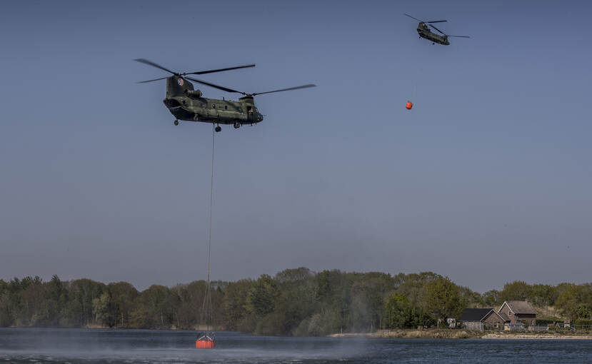Onder leiding van de civiele brandweer werden deze zomer Cougar- en Chinook-transporthelikopters ingezet voor de natuurbranden in De Peel en een duinbrand bij Brouwersdam. Foto: sergeant 1 Mike de Graaf