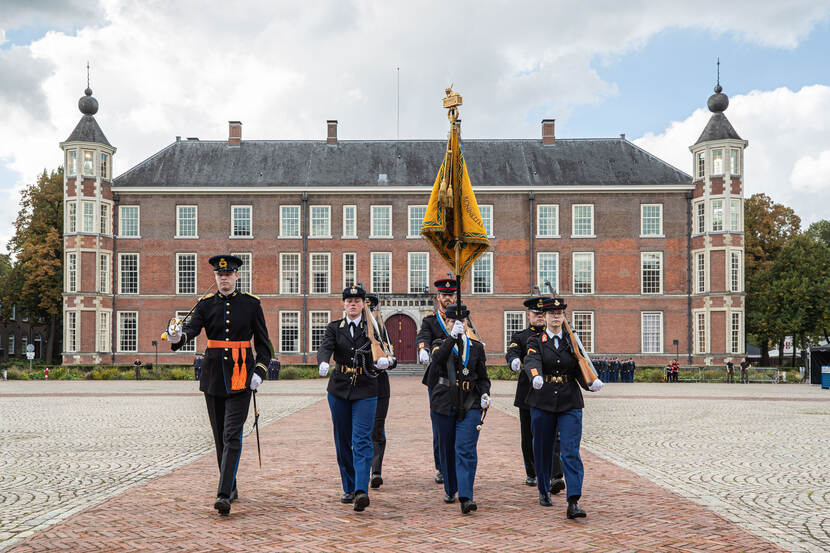 Mooier dan dit krijg je ze bijna niet. Onze fotograaf sergeant-majoor Cinthia Nijssen maakte deze fraaie foto van de vaandelwacht van de Koninklijke Militaire Academie die opmarcheert tegen de achtergrond van het kasteel van Breda. Het vaandel van de academie werd in 1903 door de Bredase burgers geschonken bij de 75ste verjaardag van de KMA. Deze foto werd gemaakt bij de uitreiking van diploma's aan 177 nieuwe officieren tijdens de zogenoemde 'bullenparade'.