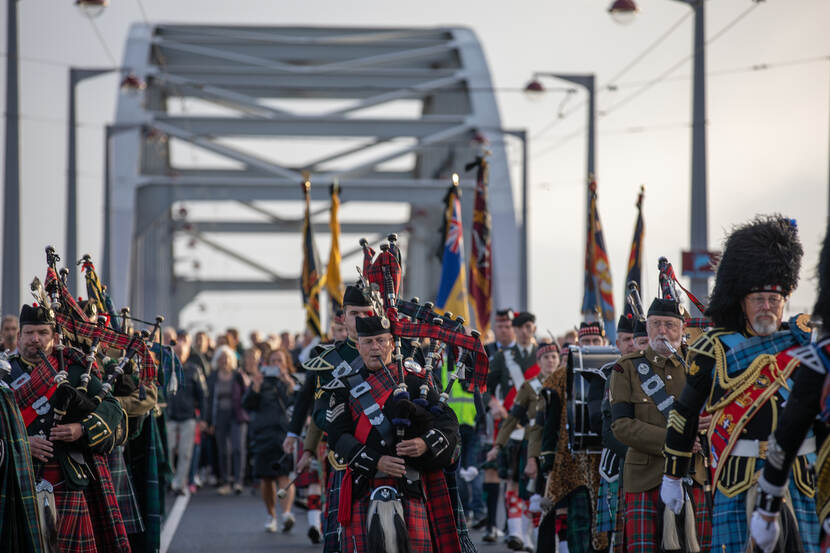 De herdenking van operatie Market Garden, maar dan met een muzikale insteek. Een groep van Britse en Nederlandse muzikanten marcheert over de Arnhemse John Frost-brug om te gedenken welke offers hier in september 1944 zijn gebracht door onder anderen soldaten van het 1st British Parachute Regiment. Foto: U.S. Army Sgt. 1st Class Austin Berner.