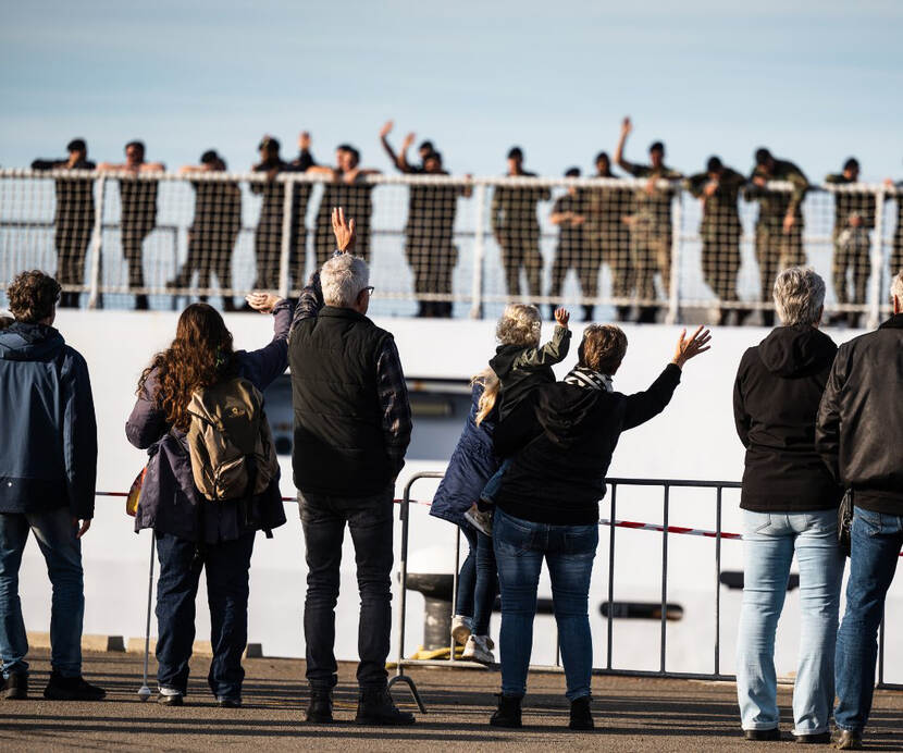 Den Helder is een havenstad vol tegenstellingen. Aan de ene kant de Nederlandse vloot die trots laat zien dat de marine paraat staat voor vrede en veiligheid. Maar aan de andere kant ook de menselijke emoties die daar bij horen. Zoals afscheid nemen van je dierbare wanneer die naar de andere kant van de wereld wordt gestuurd. Maandag werd Zr.Ms. Holland uitgezwaaid toen het schip naar het Caribisch gebied vertrok voor een term daar. Foto: Koninklijke Marine.