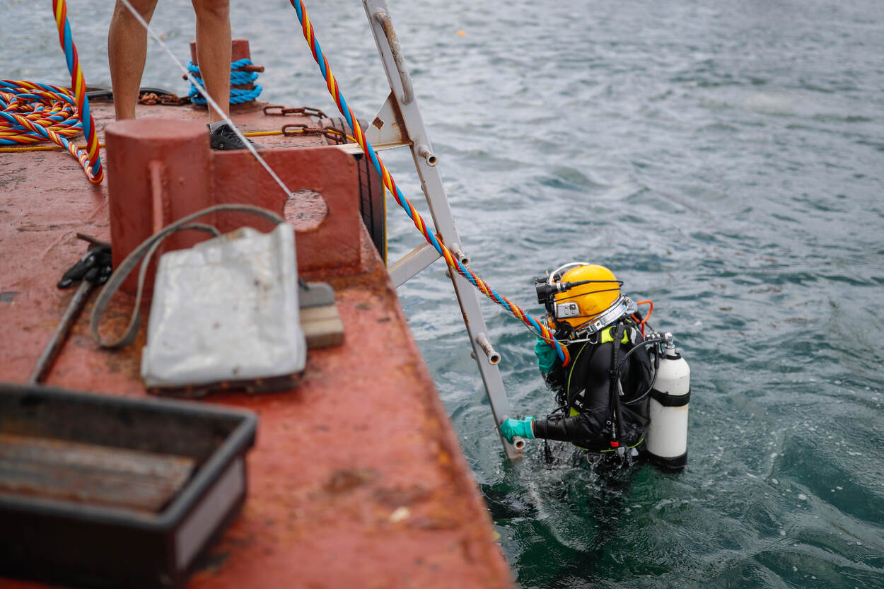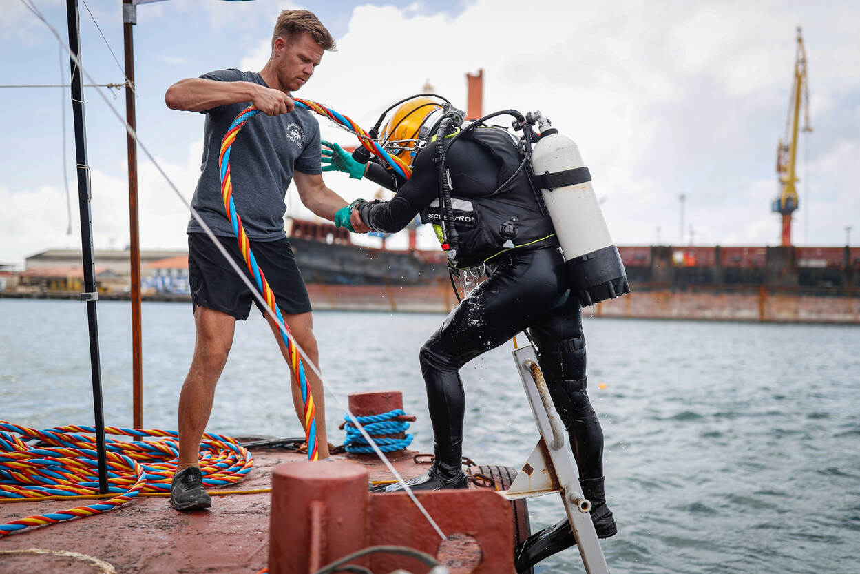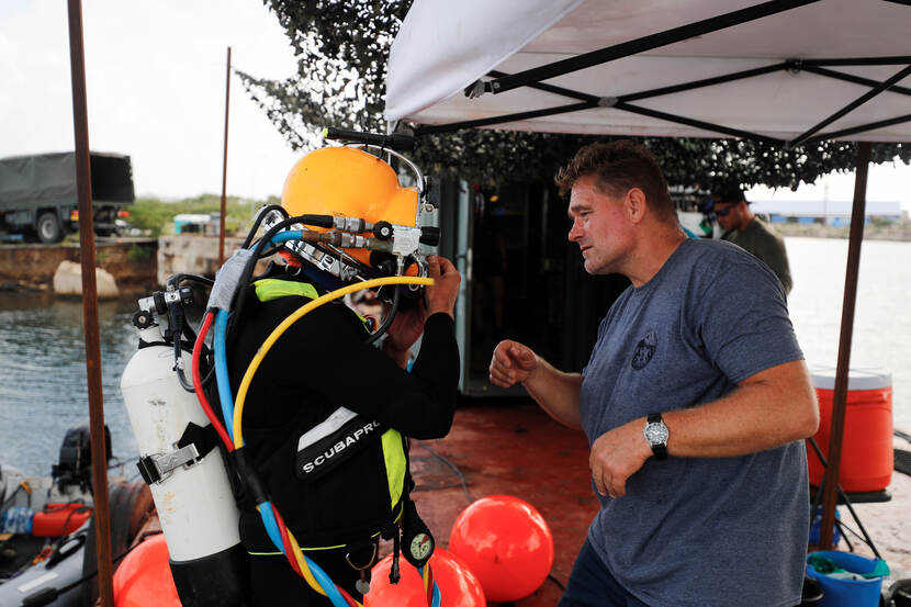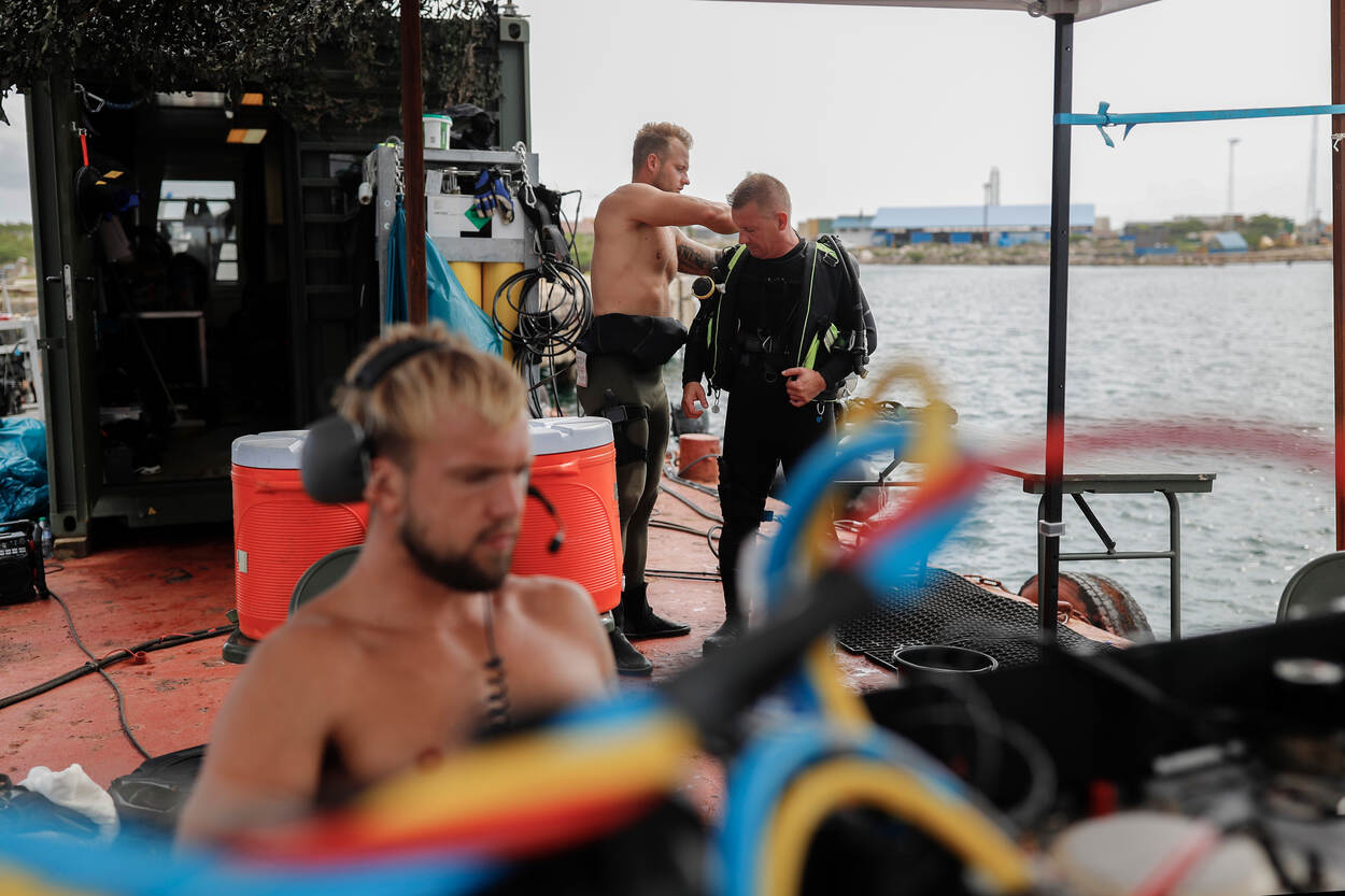 Ronkend komt een aggregaat op gang op het drijvend platform van de Defensie Duikgroep van de Koninklijke Marine. Twee duikers springen gewapend met hydraulisch gereedschap het donkere water in van het Schottegat, de haven van de Isla Raffinaderij op Curaçao. De jaarlijkse oefening Divex in de West kent dit keer een bijzonder doel: het lichten van een écht gezonken ponton.