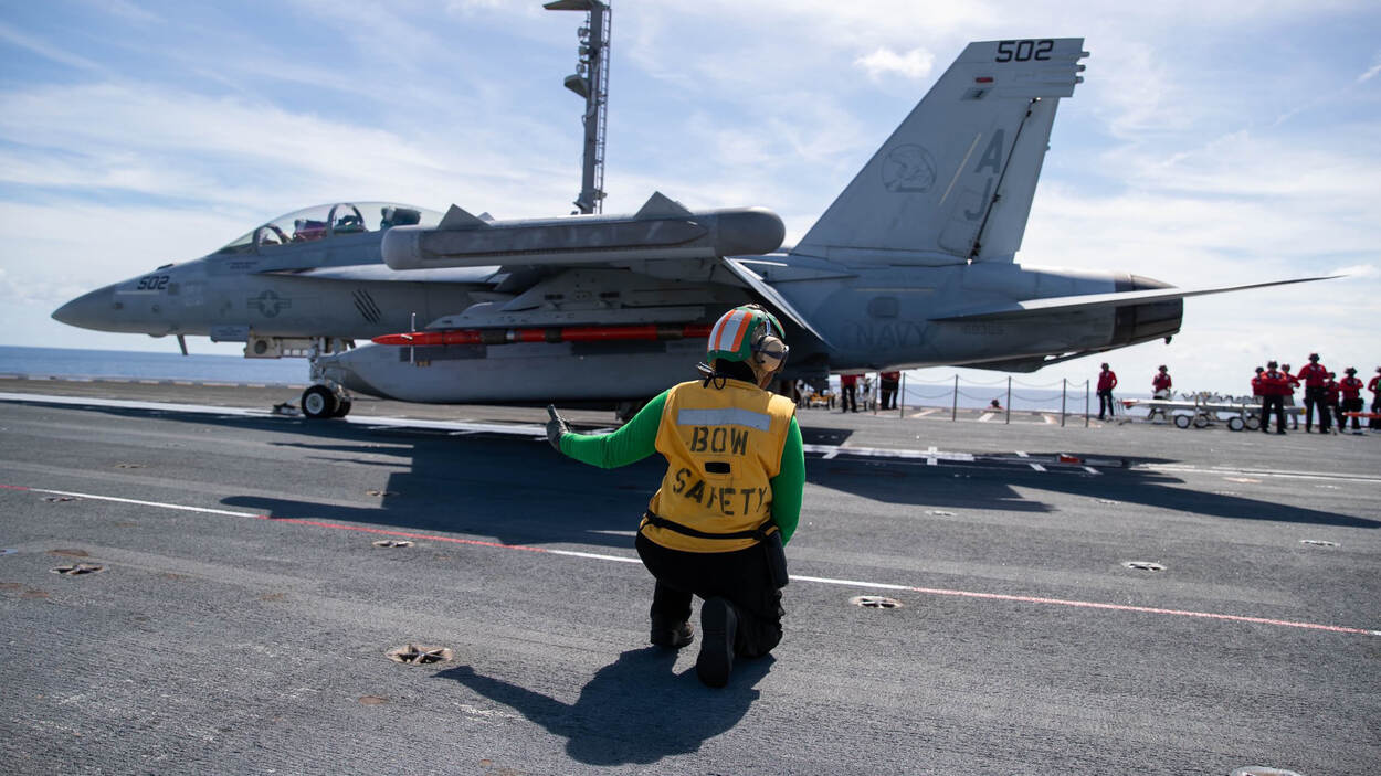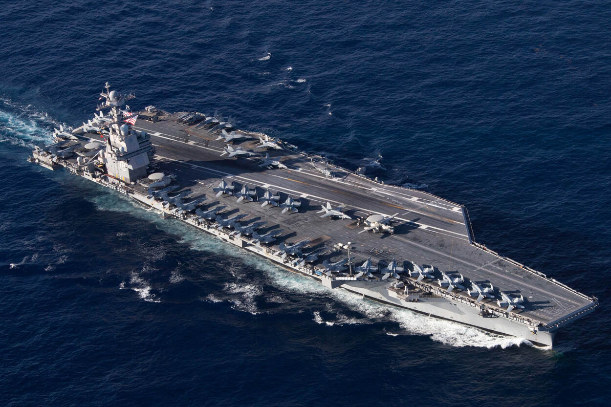 De USS Gerald R. Ford, het nieuwste Amerikaanse vliegkampschip met tientallen gevechtsvliegtuigen. Boven: Lancering van een EA-18G Growler ECM-storingsvliegtuig. Foto's: U.S. Navy.