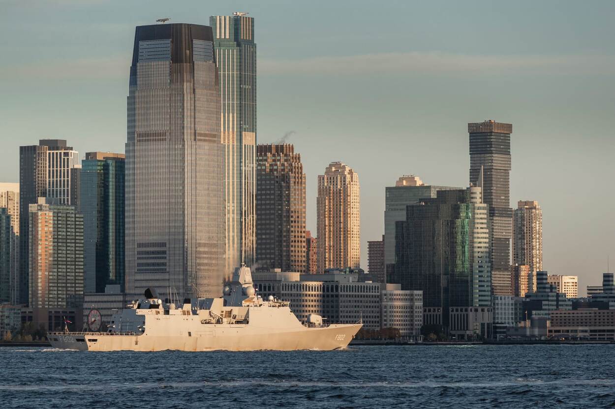 Zr.Ms. Zeven Provinciën vaart de haven van New York binnen.
