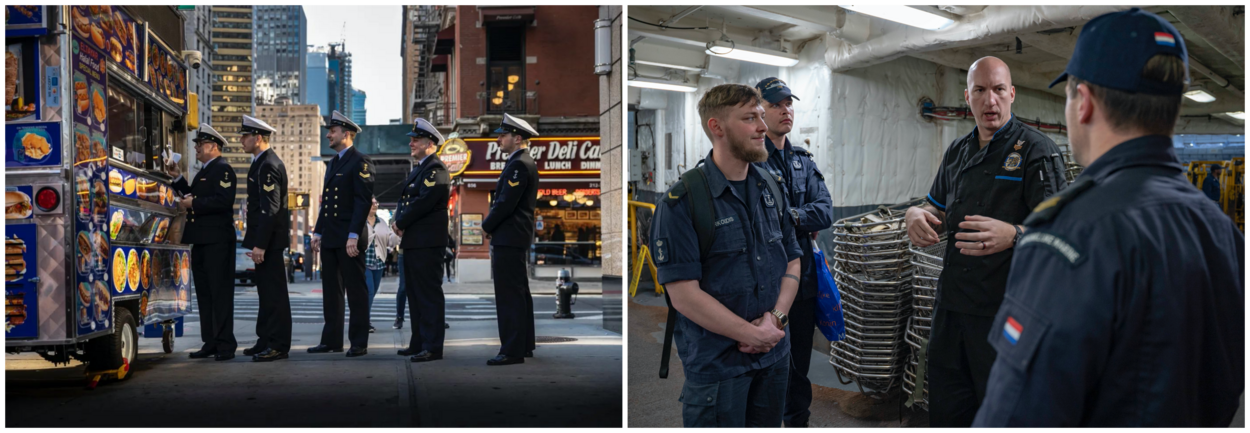 Bemanningsleden in de rij voor een New Yorkse hamburgertent. Rechts: De bemanningsleden van Zr.Ms. De Zeven Provinciën mochten een kijkje nemen op de Ford. Foto: MCS1 Ryan Seelbach. Geen pleziertochtje