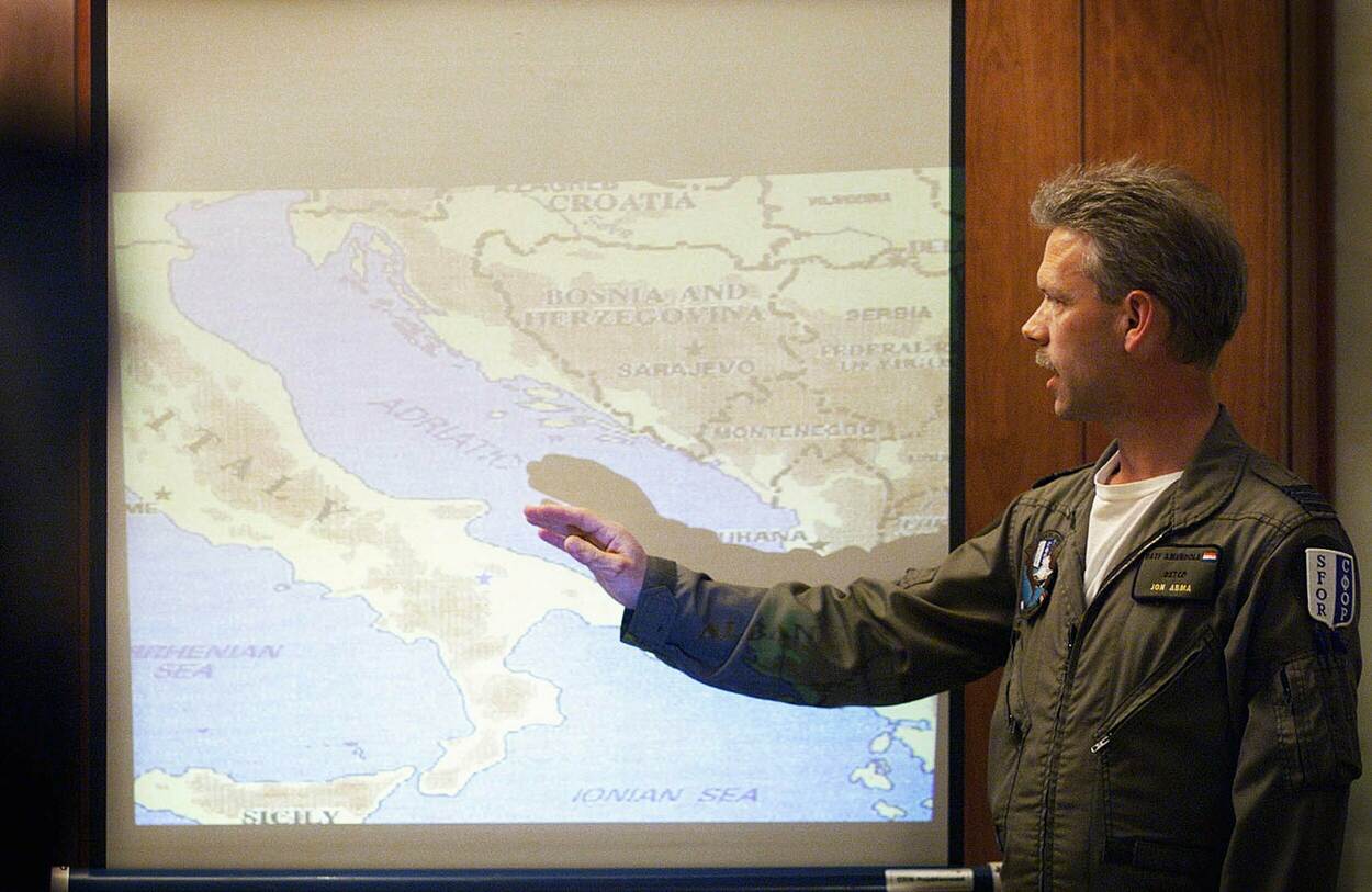 “We wisten op 23 maart, dus één dag voor de missie, al dat we ingedeeld waren in de tweede aanvalsformatie van de NAVO-operatie. Zo’n formatie, in vaktaal een package, bestaat uit verschillende soorten vliegtuigen. Afgezien van de toestellen die bommen moeten afwerpen, gaat het om luchtverdedigingsjagers, vliegtuigen die de vijandelijke luchtafweer moeten storen of uitschakelen en, op wat grotere afstand, de vliegtuigen voor de ondersteuning zoals vliegende radarstations, commandotoestellen en tankvliegtuigen.