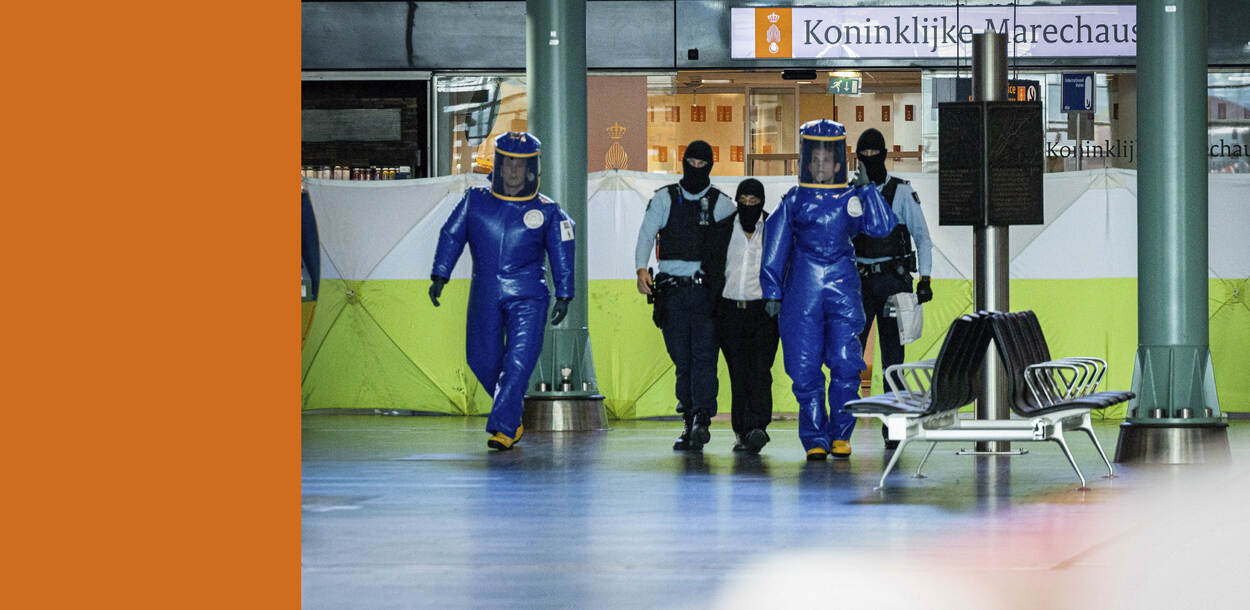 De verdachte man werd daarop door een zogeheten ontsmettingsstraat gehaald en is vervolgens door de marechaussee aangehouden voor bedreiging. Uit onderzoek van de CBRN-eenheid en de Milieuongevallendienst van het RIVM bleek uiteindelijk dat het geen gevaarlijke stoffen betrof.