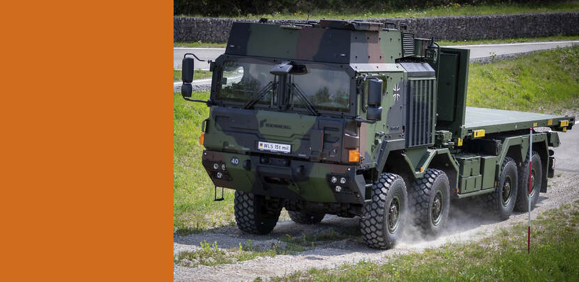 Door de aflevering van de MULTI 2 (voluit Mechanisierte Umschlag-Lagerung-Transport-Integration) vierassers neemt de logistieke flexibiliteit van de Bundeswehr sterk toe. De kolos met een vermogen van 540 paardenkrachten kan met een gepantserde cabine worden uitgerust en kan net als de Belgische vrachtauto's prima uit de voeten in het terrein. Foto: Bundeswehr/Roland Alpers).