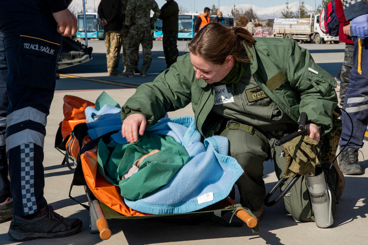 Het medevac-detachement voor Turkije bestaat, naast uiteraard de vliegtuigbemanning, uit medisch en technisch personeel. In totaal 45 personen. Later komen er een tolk, aalmoezenier en vliegerpsycholoog bij. Schonk: “Het was een taaie missie en daarom wilden we het personeel goede zorg bieden. De emotionele situatie in Turkije doet wat met je. De impact van de aardbeving is enorm. Veel mensen hebben huis en haard én familie verloren. Daarnaast vinden velen dat de Turkse overheid de reddingsactie te langzaam op gang heeft gebracht.”