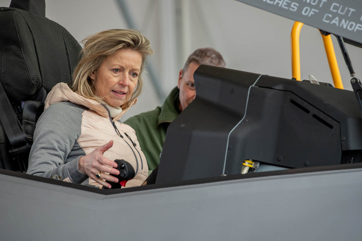 Defensieminister Kajsa Ollongren kijkt, zo lijkt het, ietwat onwennig tijdens haar bezoek aan het Nederlandse F-35 detachement dat de oostgrens van de NAVO bewaakt. Ze liet zich natuurlijk bij die gelegenheid voorlichten over de werkzaamheden van onze luchtmachters in Oost-Europa. De foto werd gemaakt door onze collega sergeant-majoor Cristian Schrik.