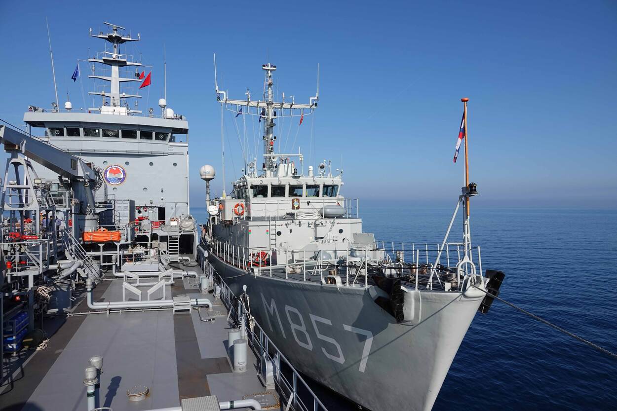 Het Nederlandse mijnenbestrijdingsvaartuig Zr.Ms. Makkum is momenteel ingedeeld bij het NAVO-vlootverband SNMCMG2 in de Middellandse Zee. Dit is één van de vier vaste vlootverbanden van het bondgenootschap. Het is gespecialiseerd in de bestrijding van mijnen en andere explosieven. Op de foto rechts de Makkum, vastgemaakt aan het Turkse logistieke ondersteuningsschip Yzb. Güngör Durmuş. Fotograaf onbekend, foto via social media.
