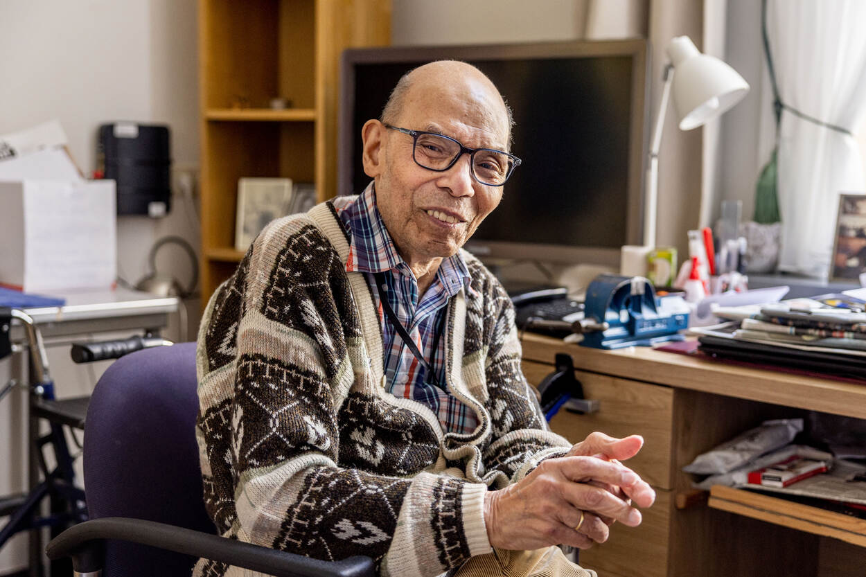 Een bescheiden kamer met lichte muren en twee vrolijke schilderijtjes aan de wand. Een bureau met stapels papieren en foto’s staat tegen het metershoge raam waar het licht fel naar binnen schijnt. “Zal ik je even omdraaien pap”, klinkt de stem van 61-jarige zoon Maurits Richard Baal.