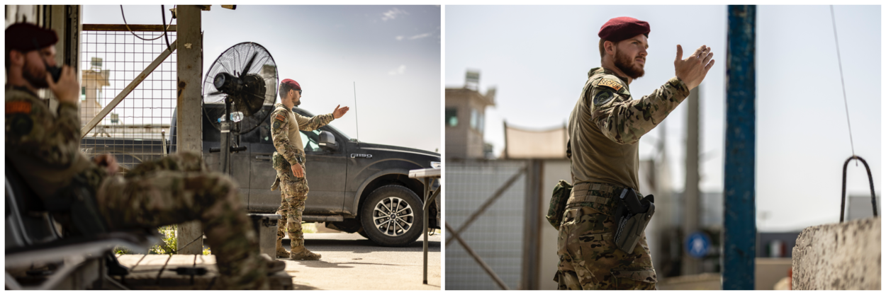 Korporaal Tom staat pal in de zon op post Alpha; de toegangscontrole op de base voor iedereen die door wil rijden, ongeacht rang of nationaliteit. Waar het een week geleden nog met bakken uit de hemel kwam “we stonden hier aardig af te niften”, tikt het kwik nu de dertig graden aan. Op de achtergrond blèrt ‘The show must go on’ uit een speakertje in het wachthok. “Al lijkt dit weinig uitdagend, je moet continue scherp blijven op ieder gezicht, iedere pas.” Zijn maatje korporaal Bas knikt instemmend en klokt een flesje water weg. “Het is wel lekker dat we hier met twee man staan. Dat is genoeg om door te wisselen waardoor je snel kunt werken.”