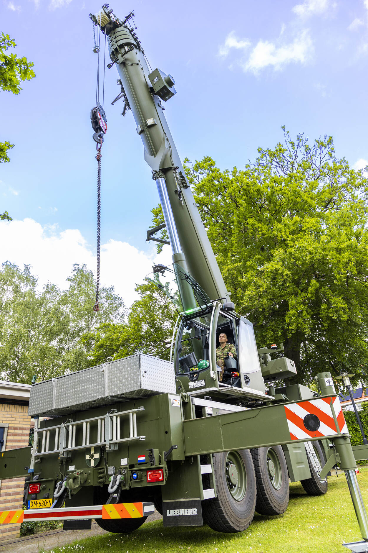 Het ochtendprogramma bestaat uit veel theorie over zwaartepunten en verschillende kleuren banden voor het hijswerk. Een deel van het terrein op Bronbeek is dan al bezet door kranen en materiaal van de genie, dat met zes specialisten is uitgerukt. Korporaal Thomas (102 Constructiecompagnie) is met ‘zijn’ nieuwe LTM 1055 vanuit Wezep komen rijden en er is een spider crane uit Duitsland ingehuurd.