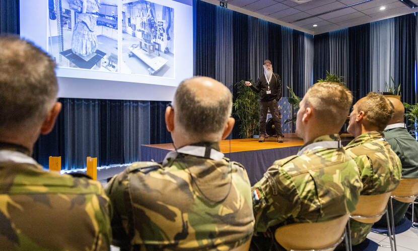 Een museum dat met robuuste werktuigen van Defensie fragiele kunstwerken verplaatst. Het lijkt tegenstrijdig, maar gisteren demonstreerde het jubilerende Wapen der Genie (275 jaar oud) bij Museum Bronbeek hoe dat in zijn werk gaat. Zo’n honderd specialisten van musea uit de hele wereld streken neer in Arnhem, om te leren van dé autoriteit op dit gebied; de kleurrijke Amerikaan Kevin Marshall.