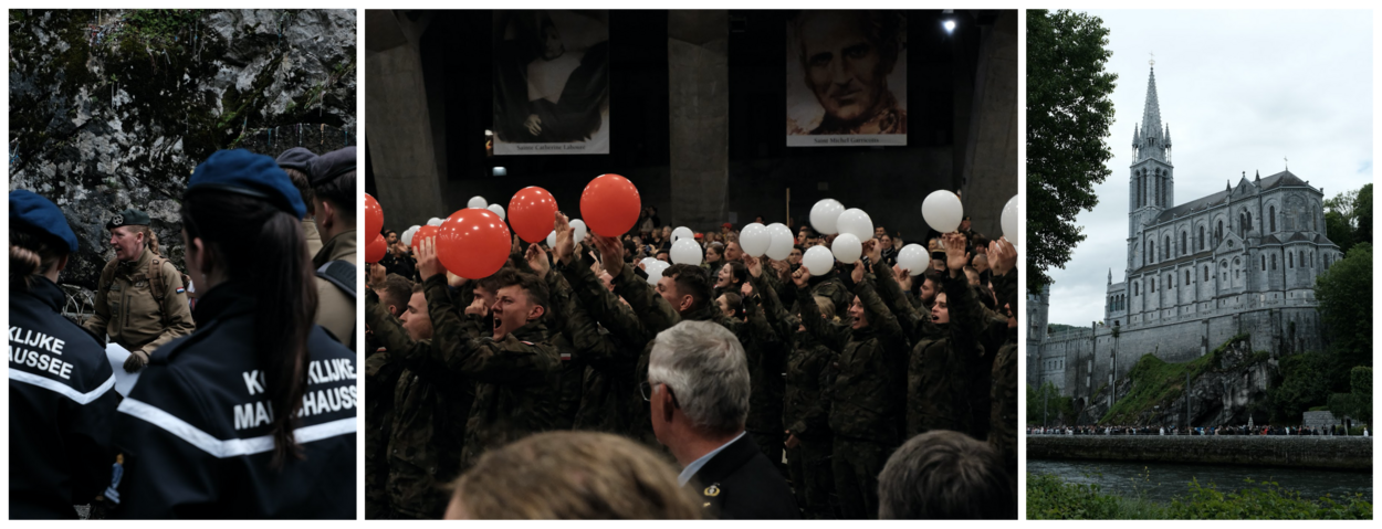 Meerdere groepen, maar één enkele eenheid: de Nederlandse delegatie tijdens de recente Militaire Bedevaart naar het Franse Lourdes. Die bestond uit marechaussees-in-opleiding, luchtmachters en leerlingen Veiligheid en Vakmanschap. In totaal kwamen veertienduizend militairen van over de hele wereld voor een paar dagen samen om elkaar te ontmoeten, te steunen en ontvallen collega’s te herdenken.