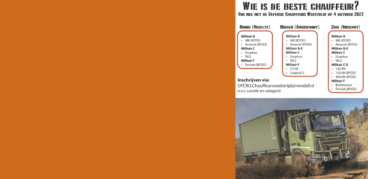 Welke van de vier krijgsmachtdelen heeft de beste chauffeurs in huis? Dat zal blijken tijdens de Defensie Chauffeurs Wedstrijden op 4 oktober 2023. Nee, het gaat niet alleen om de stuur- en schakelvaardigheden, ook kennis van de theorie en de Wegenverkeerswet zijn gevraagd. Vraag toestemming aan je commandant en schrijf je in!