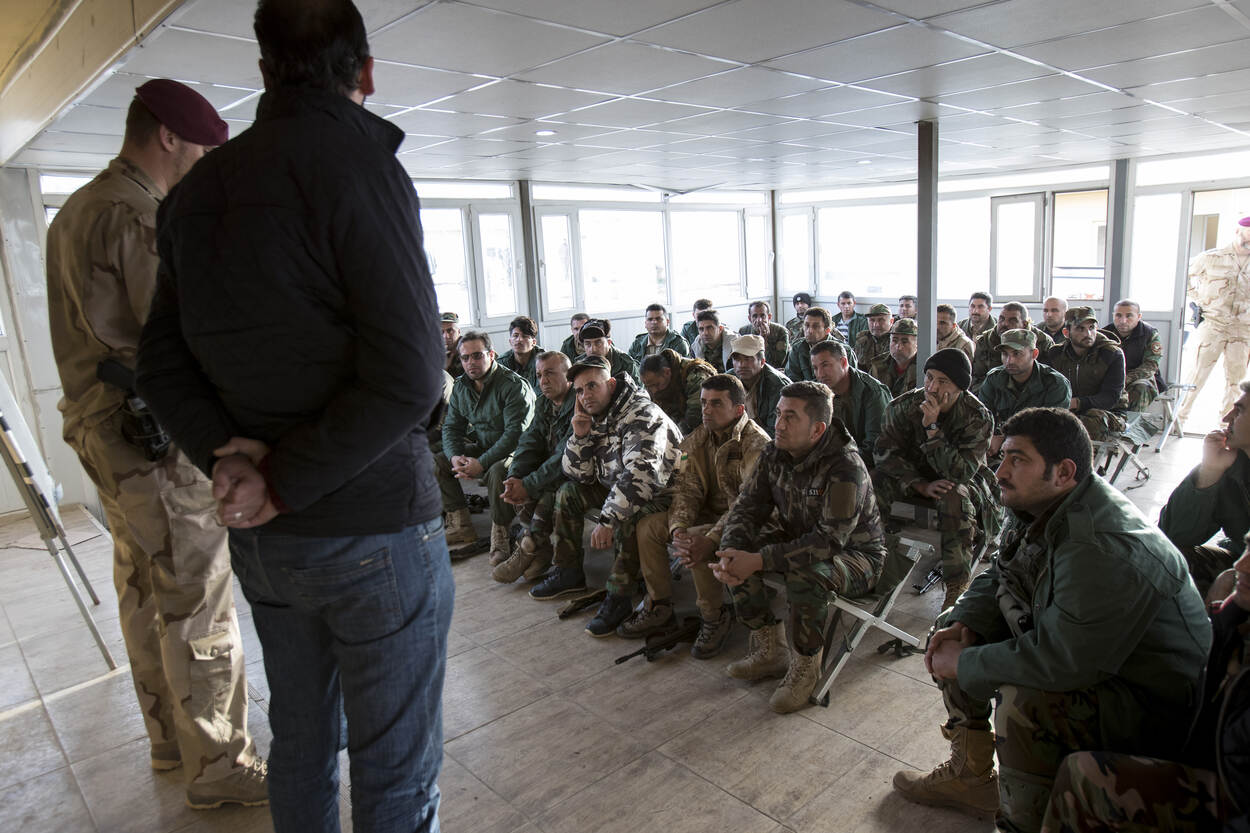 In bijzijn van een tolk krijgen Afghaanse militairen les van Nederlandse mariniers.