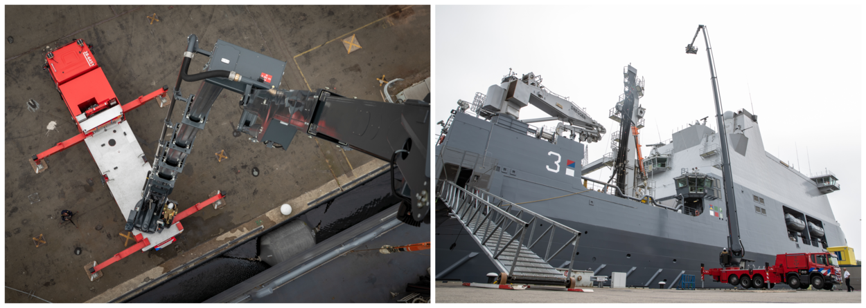 De specialistische brandweerlieden van de marine zijn de komende dagen aanwezig voor de bestrijding van calamiteiten. Het KMB heeft daarvoor de Scania ‘P500’ met z’n Bronto-opbouw meegenomen naar de Eemshaven. Dat is de grootste hoogwerker van de Benelux met zijn uitschuifbare arm van 61 meter. Het twaalf meter lange voertuig is speciaal bedoeld om moeilijk bereikbare branden aan te vallen.
