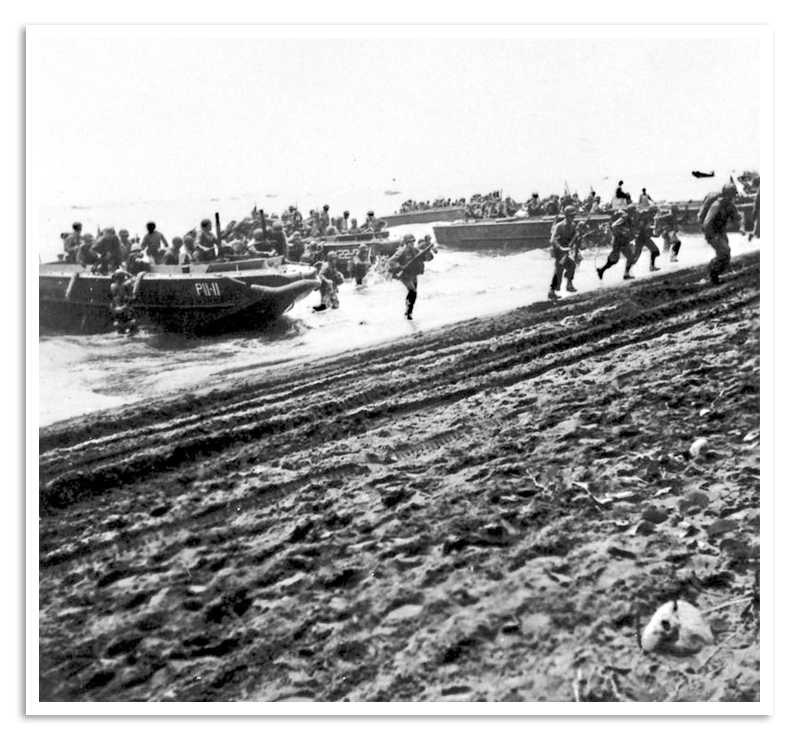 Mariniers van de 1st Division bestormen het strand van Guadalcanal op 7 Augustus 1942. Foto: U.S. Marine Corps, U.S. National Archives.