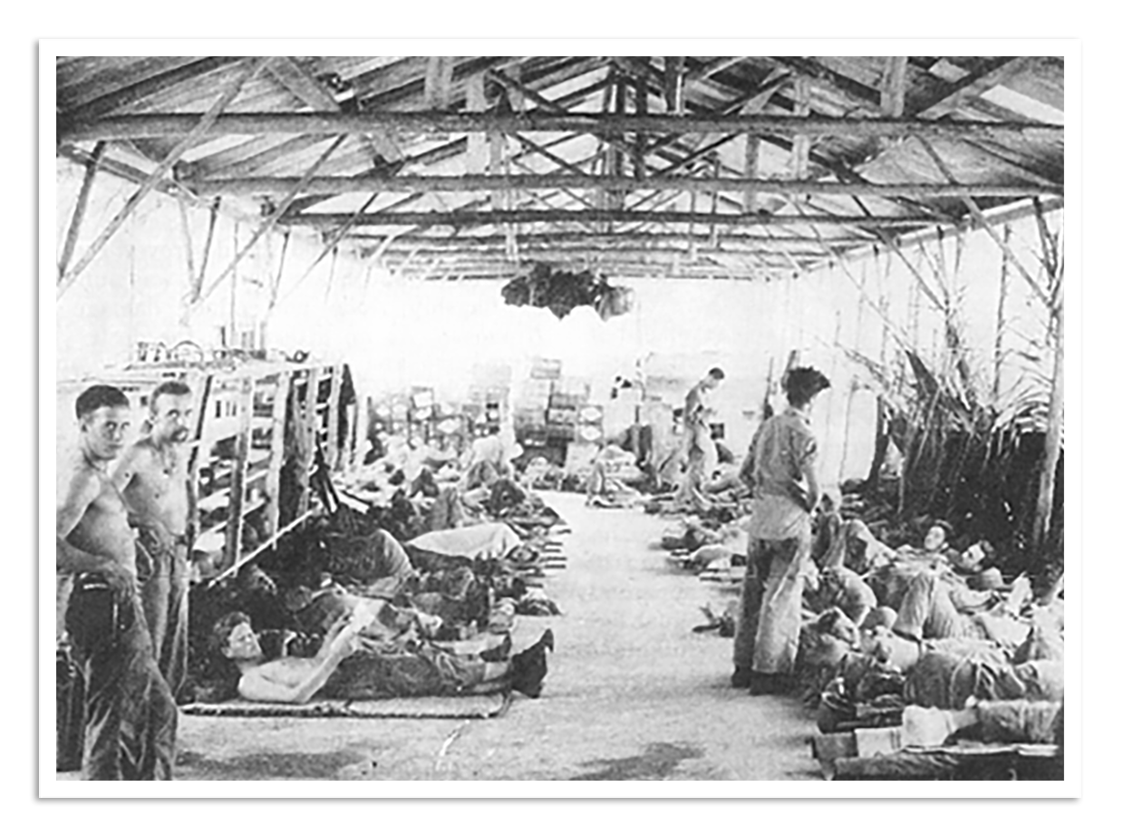 Naast de Japanners hadden de Amerikaanse GI's af te rekenen met nog een gevaarlijke tegenstander: malaria. Opname gemaakt in een geïmproviseerd veldhospitaal, waarschijnlijk in oktober 1942.