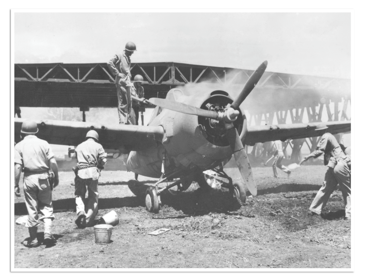 Deze MAG-23 F4F-4 Wildcat wordt geblust met de ouderwetse emmertjes water-methode. Let ook op de vele kogelgaten in de propellerbladen. Het vliegtuig raakte beschadigd tijdens de Japanse luchtaanval op Henderson Field, Guadalcanal, augustus of september 1942. Foto US Marine Corps.