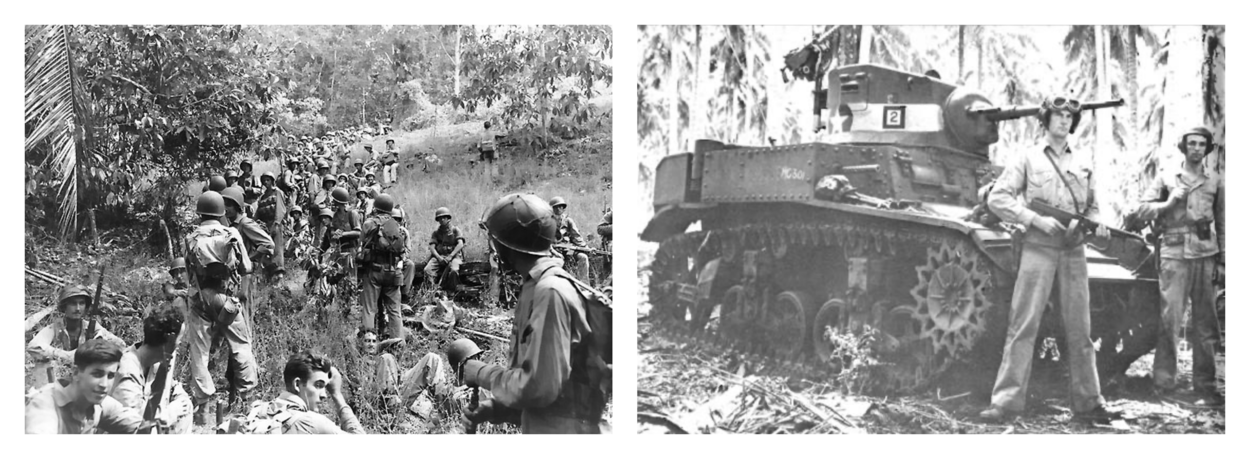 Amerikaanse mariniers tijdens een gevechtspauze op Guadalcanal. Foto rechts: Een M3A1 Stuart tank op Guadalcanal in 1942. Scan uit het boek Bloody Ridge: The Battle That Saved Guadalcanal van Michael T. Smith.