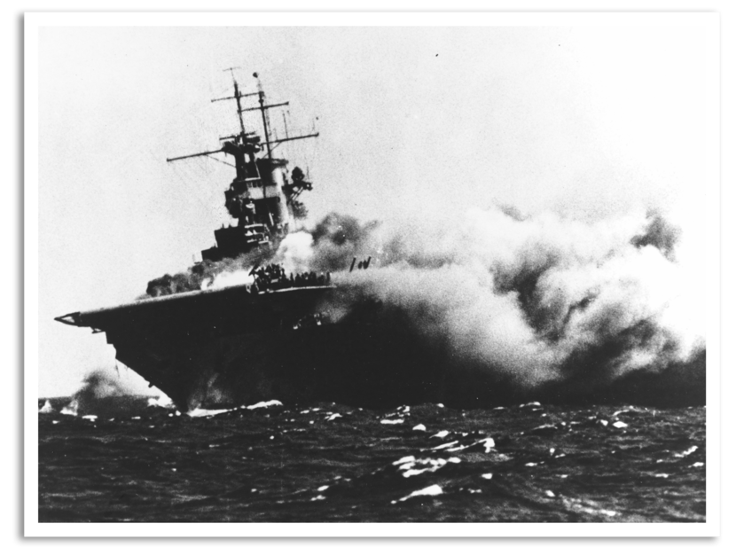 Op 15 september 1942 wordt het Amerikaanse vliegdekschip Wasp getorpedeerd door een Japanse onderzeeboot en gaat brandend ten onder. Foto U.S. Navy.