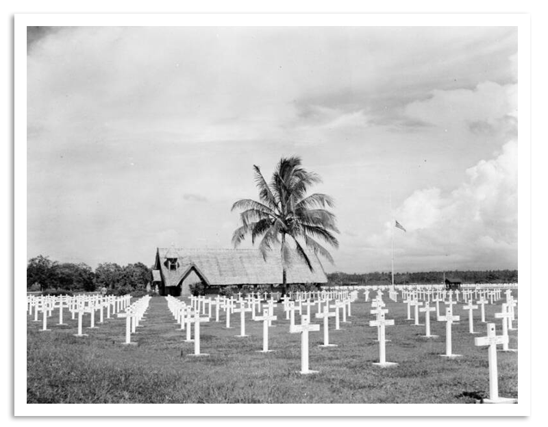Begraafplaats op Guadalcanal voor zowel geallieerden als Japanse gevallenen. Foto gemaakt in 1945.