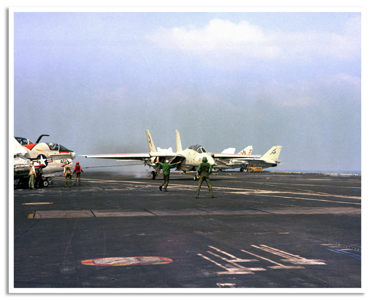 Een F-14 van het marinesquadron VF-41 Black Aces landt op de USS Nimitz tijdens operaties in de Middellandse Zee kort voor het incident met Libië. Foto: U.S. Navy.