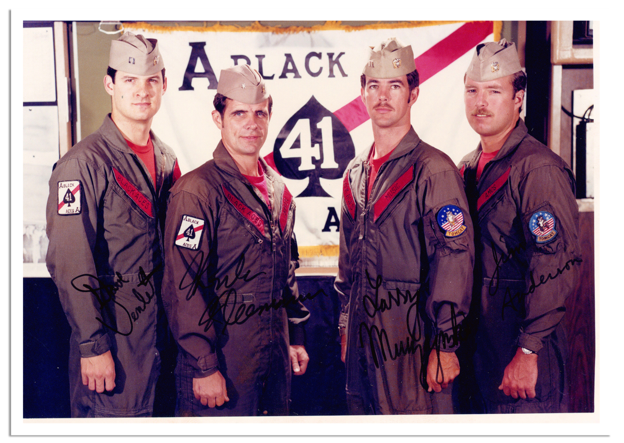 Een foto van de bemanningsleden van de twee F-14 Tomcats die bij het incident met de Libiërs waren betrokken. Foto: U.S. Navy.