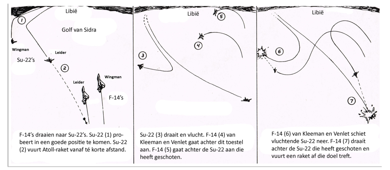 De onderschepping in beeld. Na de Libische aanval (links) manoeuvreren de Amerikaanse vliegers hun F-14 Tomcats zodanig dat ze de Libische Su-22's kunnen neerhalen. Tekening: The Hook Magazine/Tailhook Association.